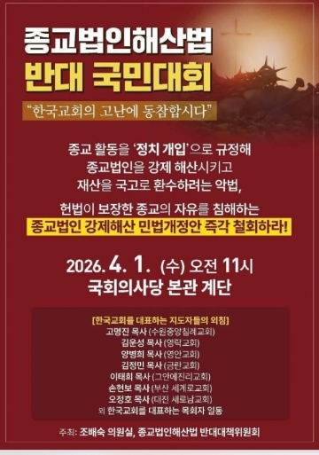 2026년 1월 9일, 국회에는 '민법 일부개정법률안'(최혁진 의원 대표발의, 의안번호 제2215932호)이 제출되었다. 표면적 목적은 비영리법인의 감독 강화와 반사회적 법인 해산이었으나, 교계는 즉각 이를 '종교법인 해산법', '정교유착방지법'으로 규정하며 강력하게 반발했다. 한교총, 한기총, 대광기총 등 주요 개신교 연합기구들이 일제히 반대 성명을 발표했고, 한국교회법학회는 국회에 상세한 검토 의견서를 제출했다.
